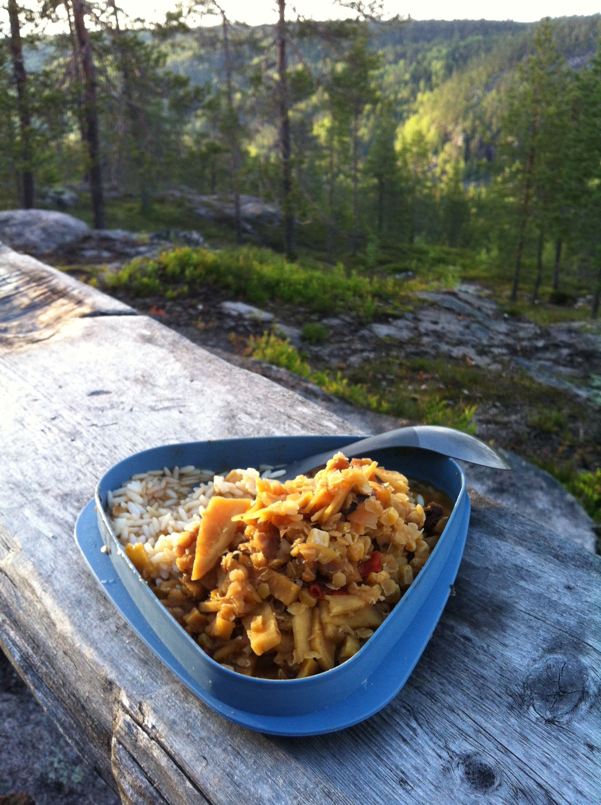 Teimme tätä arkiruokana kotona. Bataatti ja punainen curry sopivat erinomaisesti yhteen. En ollut kuullut bataatin kuivaamisesta, mutta kun kokeilin, se onnistui hyvin. Siispä arkisesta kotiruuasta tuli eräruoka.