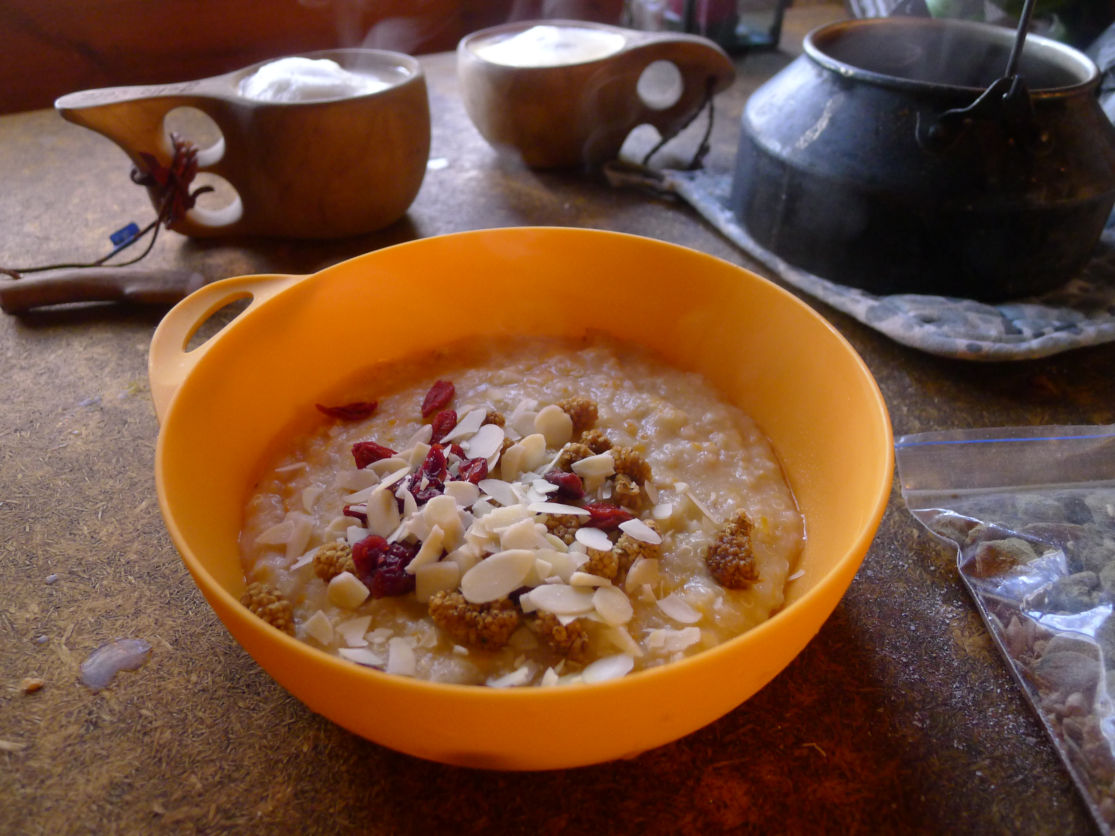 Porkkanapuuro maistuu ihanasti tuoreelta porkkanalta. Valmistimme porkkanapuuroa ensin kaurahiutaleista (10 min keittoaika). Sitten totesimme, ettei ole järkeä tehdä turhaa tiskiä ja käyttää hitaita kaurahiutaleita kun on nopeitakin (1 min suoraan lautaselle) – paitsi jos käyttää kauraa ”parempia” raaka-aineita.