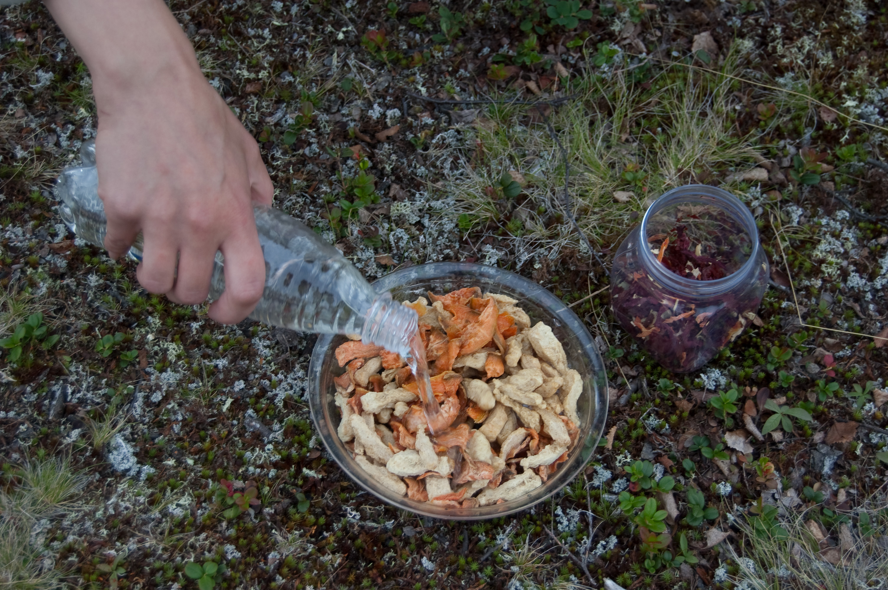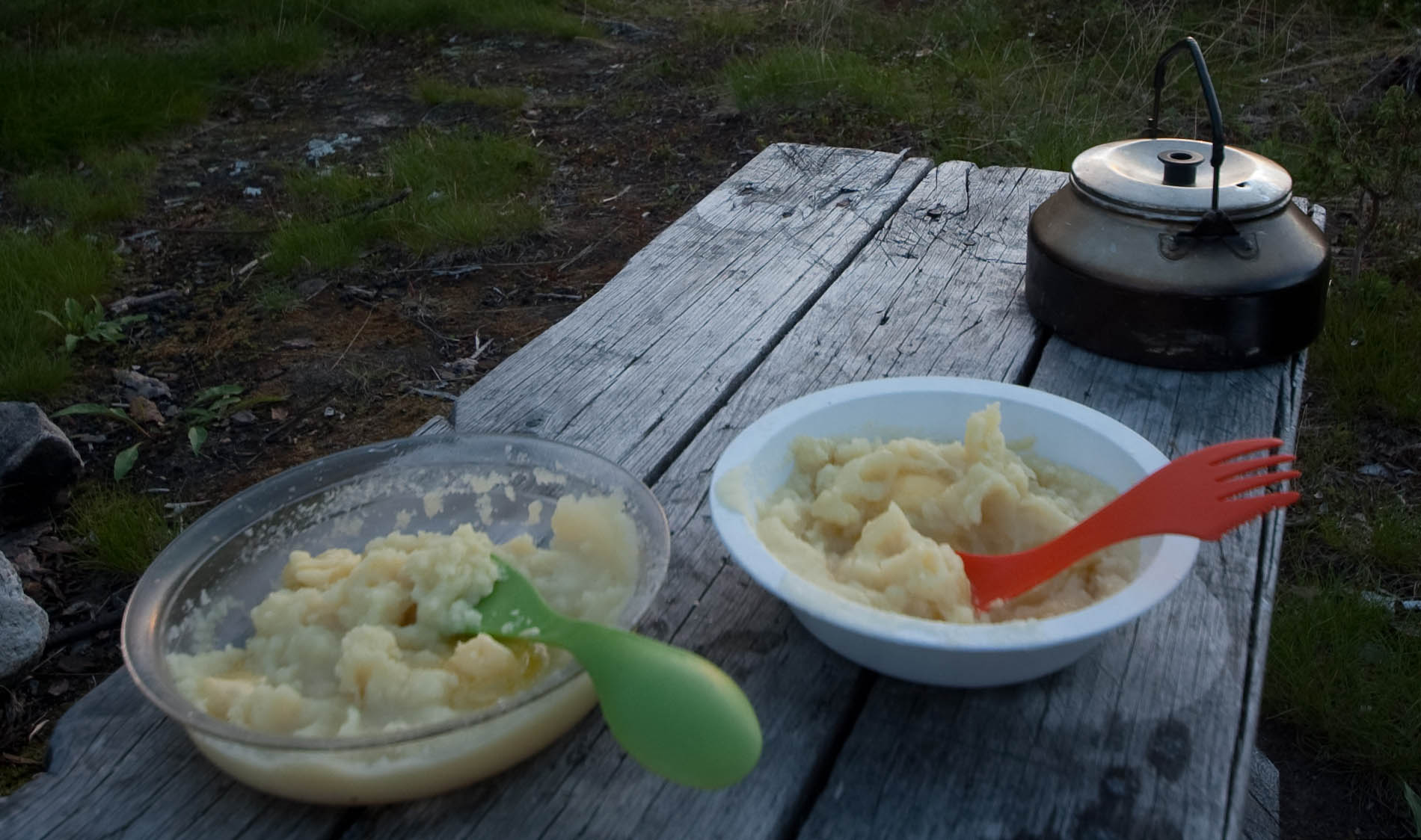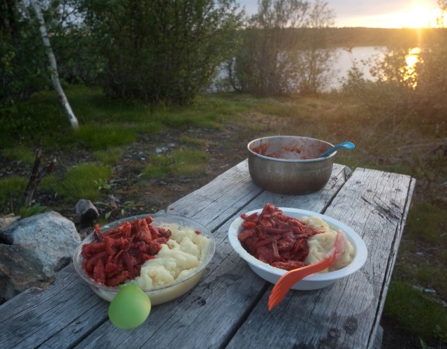 Ihana slaavilainen tuulahdus eräretkelle. Sopivan iso annos ja herkullisesti hieman makeahko. Jos matka on lyhyt tai kuljet melomalla, lisää joukkoon vielä yksi suolakurkku ja smetanaa. On tosin hyvää ilmankin. Resepti syntyi 2009 Hammastunturin erämaassa kassiin jääneistä aineksista.