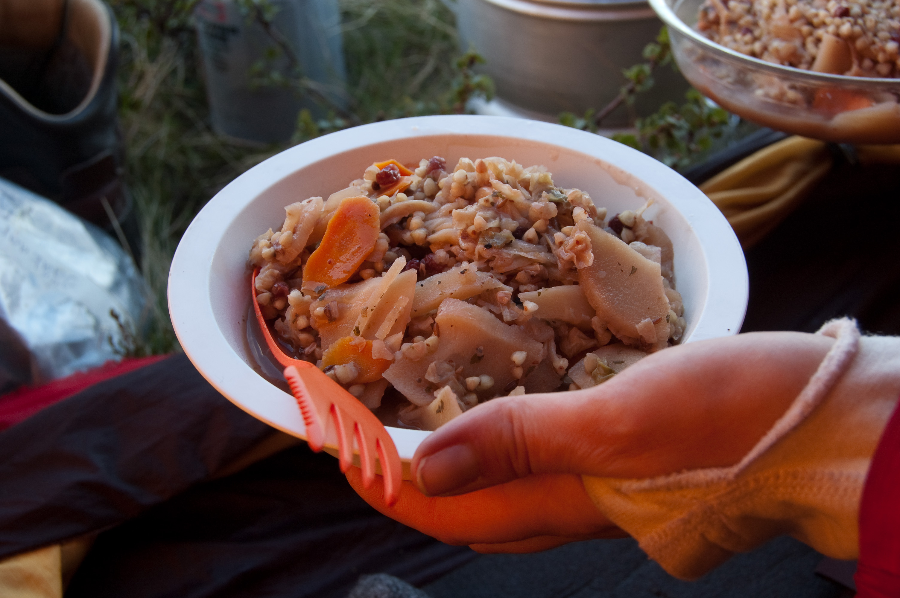 Tämä ateria vaatii tavanomaista työläämmät ennakkovalmistelut, koska useita aineksia pitää esikypsyttää ennen kuivatusta ja tattarikin on hyvä pestä etukäteen. Vaiva kannattaa, sillä Tattarijuurespata on erittäin helppo ja energiatehokas valmistaa vaelluksella.