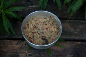 Tässä yksi meidän tyypillisimpiä erälounaita. Ei kovin kaunis, mutta varsin herkullinen ja nopea valmistaa.