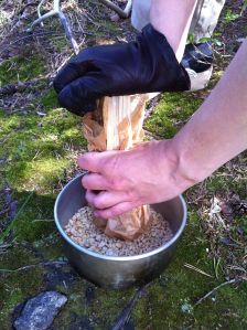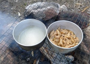 Paahda kuorellisia maapähkinänsydämiä kuivalla pannulla. Irrota kuoret pyörittelemällä pähkinöitä kauhalla isoreikäisessä siivilässä tai sormien välissä, puhalla sitten kuoret pois. Murskaa pähkinät tehosekoittimessa – tai autiotupaolosuhteissa leivinpaperiin käärityllä tasapäisellä koivuhalolla. Murskan ei tarvitse olla jauhetta, 1/8 pähkinän kokoiset palatkin ovat ok.