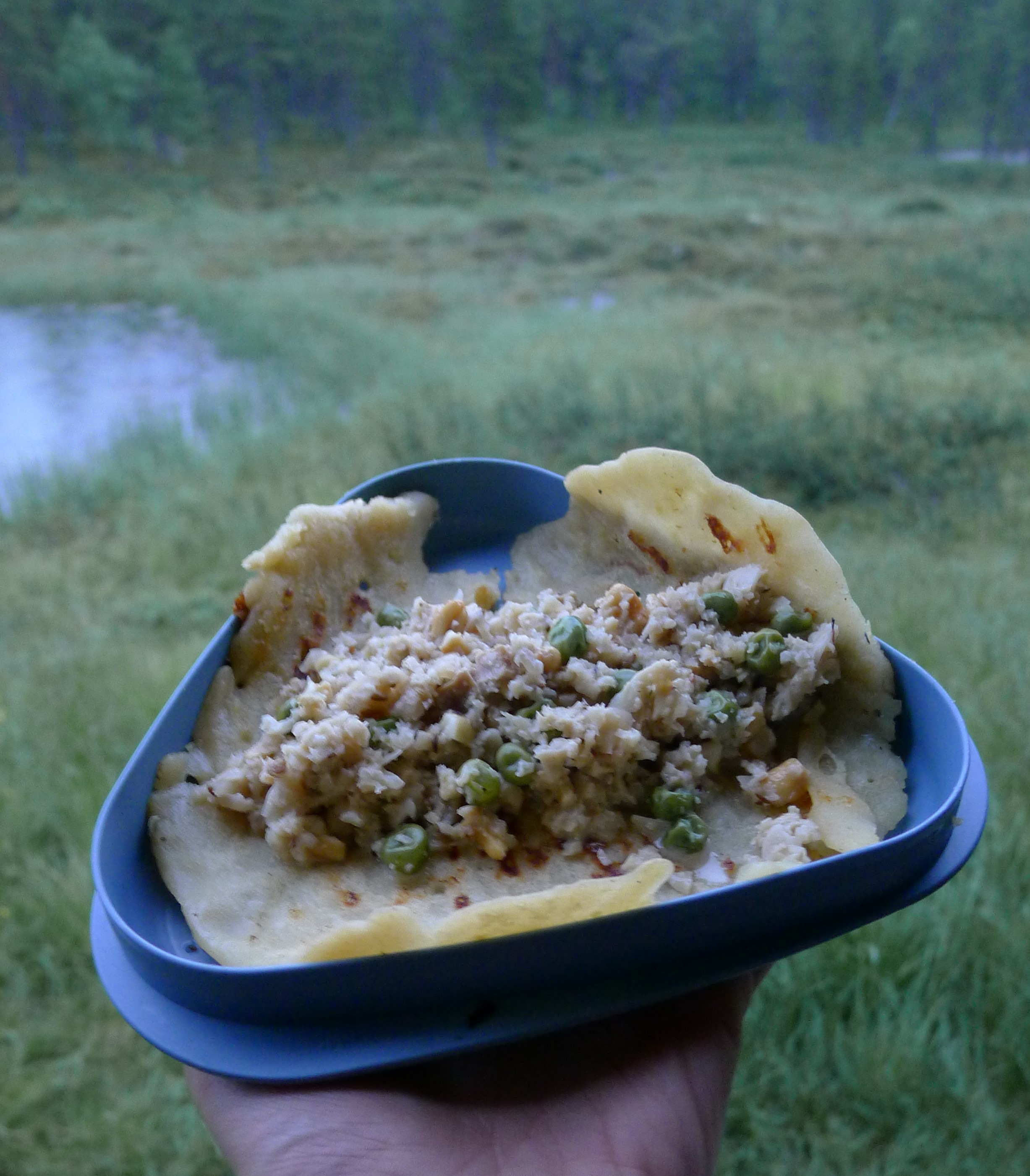 Juhlava ateria eräretken kruunaamiseen! Söin äskeittäin Hammastunturilla viimeisenä iltana alkupalaksi ”instant” vihreää linssikeittoa ja pääruuaksi näitä kukkakaalicurrytäytteisiä lettuja. Tämä on jälleen eräversio kotona tekemästäni herkusta.