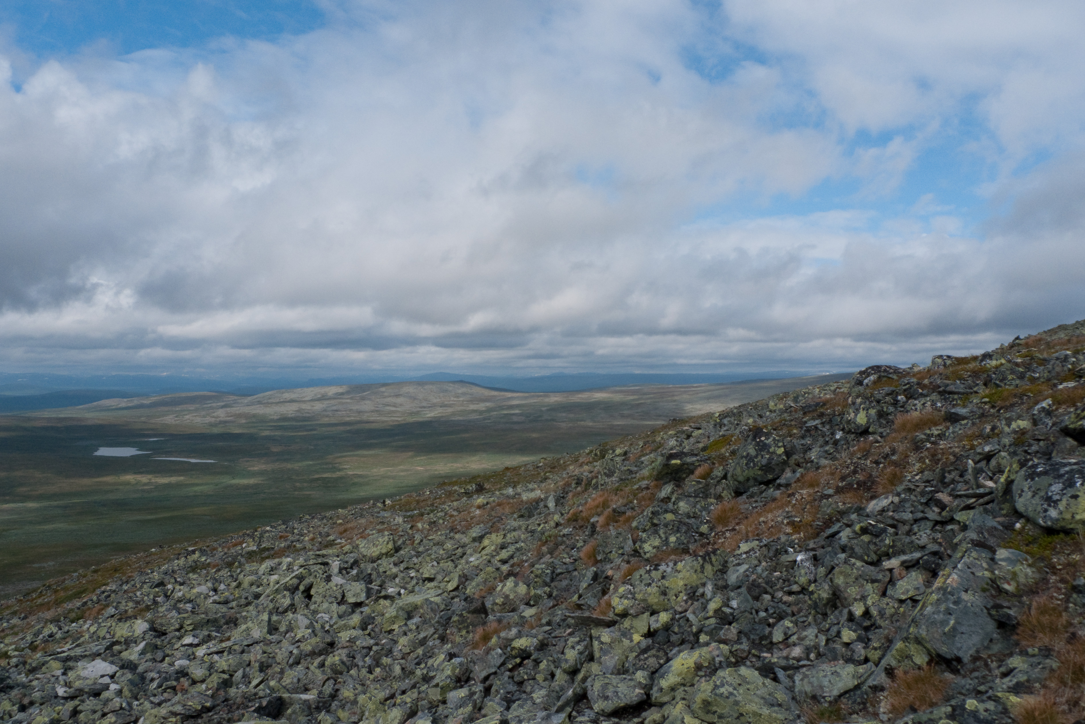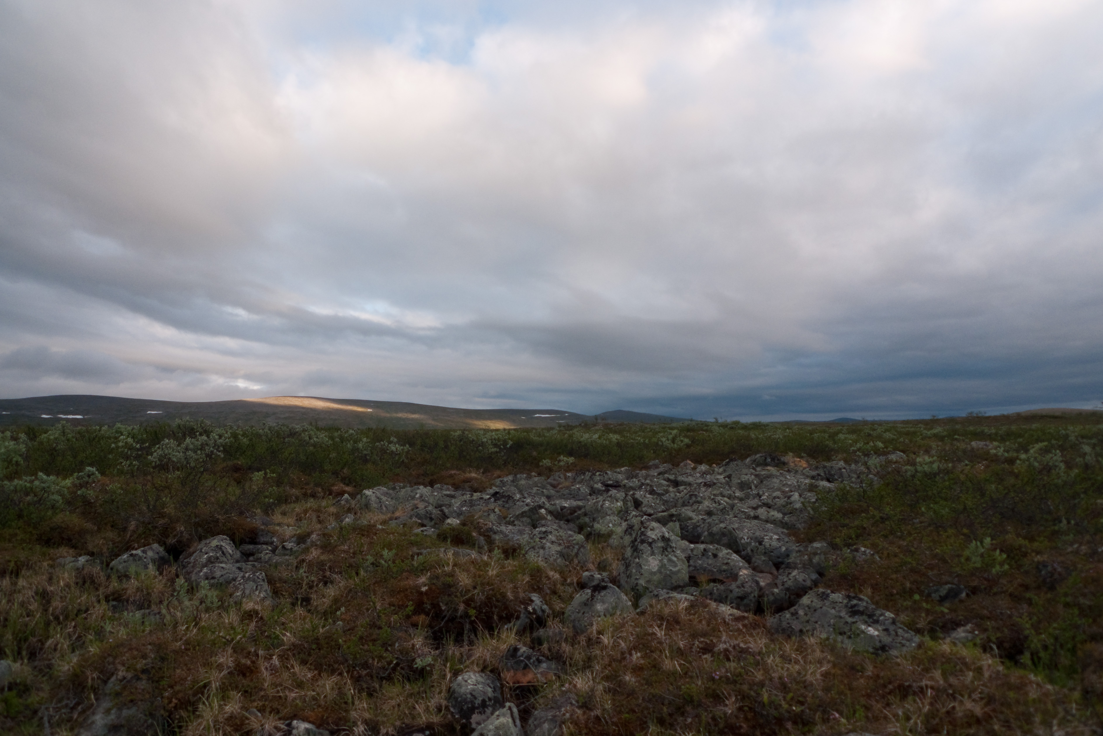 Koko päivän olimme kulkeneet yhä ylemmäs tunturiin ja maisemat olivat jatkuvasti entistä komeampia. Huipennus oli puolilta öin Biggosaivin reunalta kohti pohjoista. Teimme sinne iltaretken ilman rinkkoja. Pienestä tunturijärvestä emme saaneet kalaa, mutta näköalat olivat huikeat. Näimme lähes koko sen alueen, jota olimme alkuviikon vaeltaneet. Kaskasjoen laaksossa satoi siellä täällä.