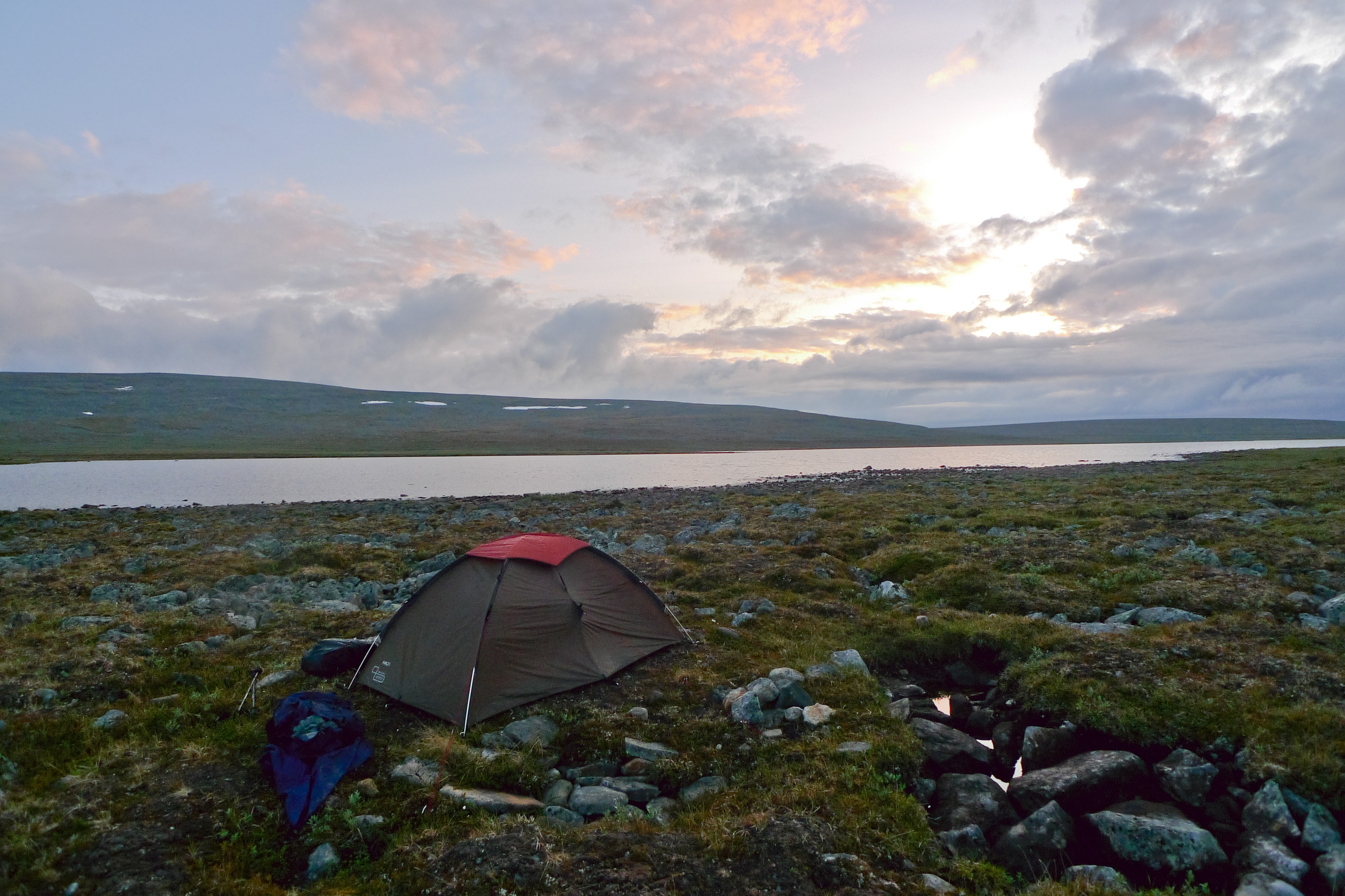 Päätimme majoittua Bizejohgierjavrille. Kivikosta oli vaikea löytää telttapaikkaa, mutta juuri teltan kokoinen pala tasaista maata löytyi lopulta järven eteläpäädystä. Järvi oli kivikkonen ja matala – ei edes yritetty kalastaa.