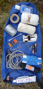 - Korjaussetti: pieni rulla ilmastointiteippiä sadeasun paikkaukseen (tällä on korjattu myös vaellussauvat ja onget), pitkä varakengännaru, hakaneuloja, paksua lankaa ja vahva neula rinkan korjaamiseen, taipuisaa rautalankaa ja varakiinnike rinkan vyöhön (lisäksi joskus ollut mukana myös silikonia teltan / sadeasujen / ilmapatjan paikkaamiseen)